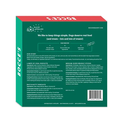 Medium Brushy Sticks: Chickpeas, Tapioca Flour, Coconut Glycerin, Apples, Brewera Dried Yeast, Coconut, Spinach, Salt, Turmeric, Organic Dried Kelp, Parsley, Lactic Acid (Preservative), Peppermint Oil, Citric Acid (Preservative), Mixed Tocopherols (Preservative) Bac'N Nutty: Oats, Peanut Butter, Bacon, Coconut Glycerin, Cane Molasses, Flaxseed, Vegetable Oil, Citric Acid (Preservative) Rudolph's Roast Biscuits: Oat Flour, Beef, Cheddar, Coconut Oil.