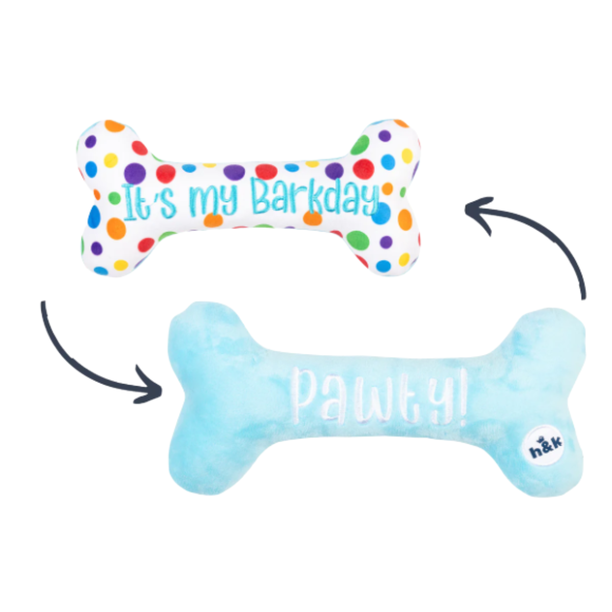 Is your furry friend's special day coming up? Make it unforgettable with the It's My Barkday Bone dog toy! One side boasts an eye-catching array of colorful polka dots surrounding the cheerful proclamation, "It's My Barkday!" It's a vibrant reminder of the joy and color pets bring into our lives every day.Flip the bone over, and you're greeted with a bright blue background and the word "Pawty!" written across it in playful lettering. It's a call to paws and celebrate, making every playtime a party!