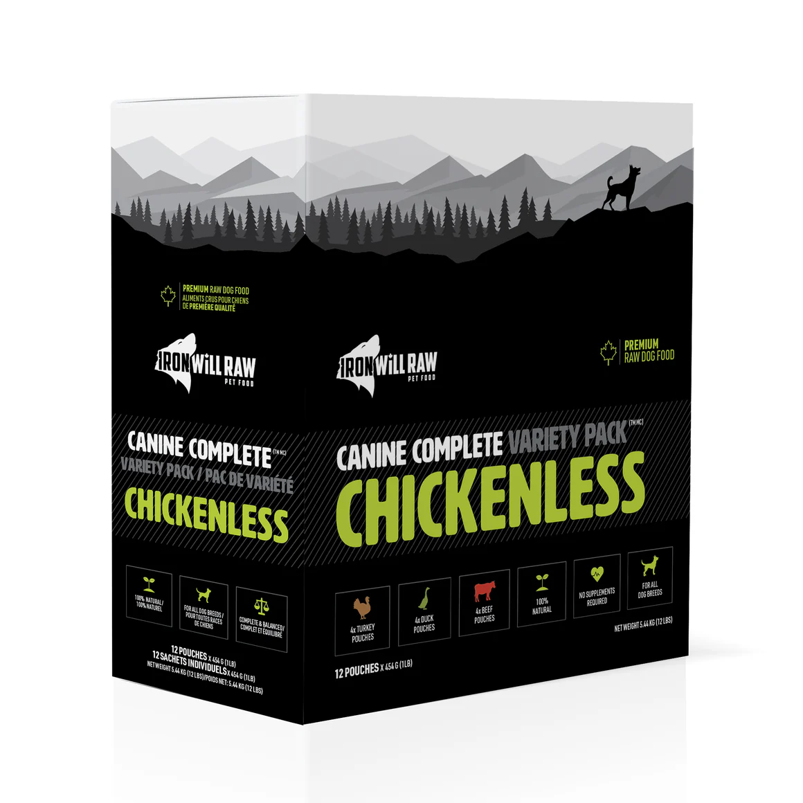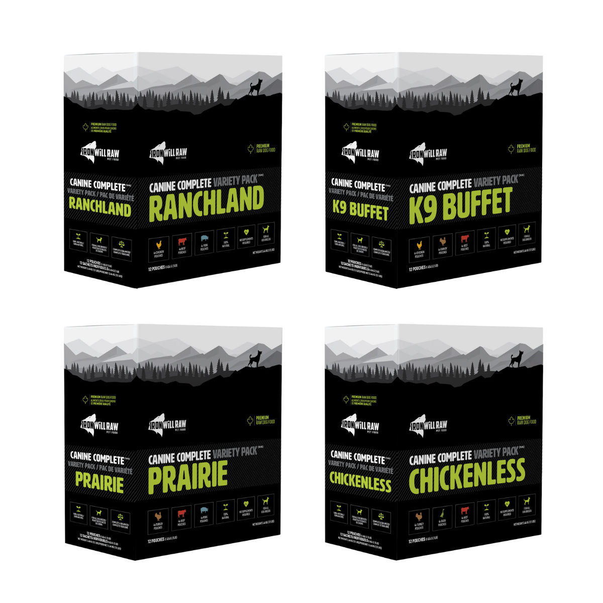 Iron Will Raw — Canine Complete Variety Packs deliver whole-food, ready-to-serve raw meals in 1-lb pouches. Each frozen pack includes twelve pouches (three flavors, four pouches each) made in a HACCP-certified facility from high-quality animal proteins and complementary ingredients. Thaw in the fridge or in cold water, serve as part of your dog’s daily feeding routine, and refrigerate leftovers for up to 3 days — no cooking required. Great for owners who want the benefits of raw feeding with simple, predictable portions.