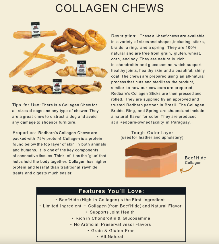 Redbarn’s Collagen Chews are packed with 75% protein! Collagen is a protein found below the top layer of skin in both animals and humans. It is one of the key components of connective tissues. Think of it as the ‘glue’ that helps hold the body together. Collagen has higher protein and less fat than traditional rawhide treats and digests much easier.