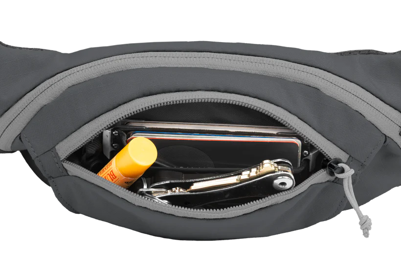 The Home Trail Hip Pack is the day-to-day, stow-and-go bag to carry you and your dog's essentials, keeping your hands free for throwing sticks and doling out treats. It has two zippered compartments and an adjustable belt for wearing on the hip or crossbody.