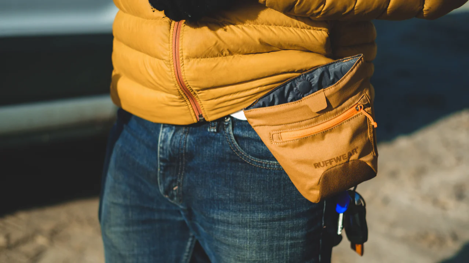 The Treat Trader™ is a quick-access, waist-worn dog treat bag designed for hands-free training sessions and everyday adventures. The secure magnetic closure keeps treats easily accessible with one hand when needed, and closes with an audible cue to keep them secure on the go. The durable shell fabric and lightweight, waterproof lining keep treats fresh and contained. A small zippered outer pocket fits a key fob, some pick-up bags, and includes a clicker-compatible loop. Bend and mold the rim for a comfortable fit, whether you wear it with the included adjustable belt or attach it directly to your waist with the integrated belt clip.