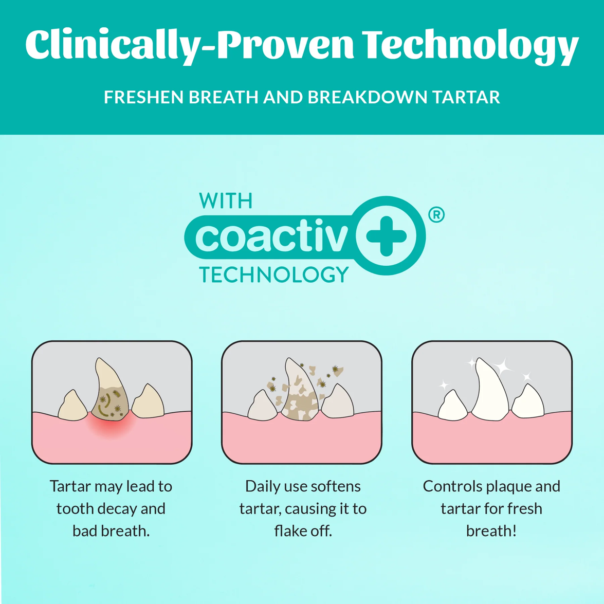 Fresher Breath flavourless water additive, powered by coactiv+® technology and clinically-proven to reduce tartar and freshen breath. The only VOHC-Accepted water additive for tartar control with no brushing required.