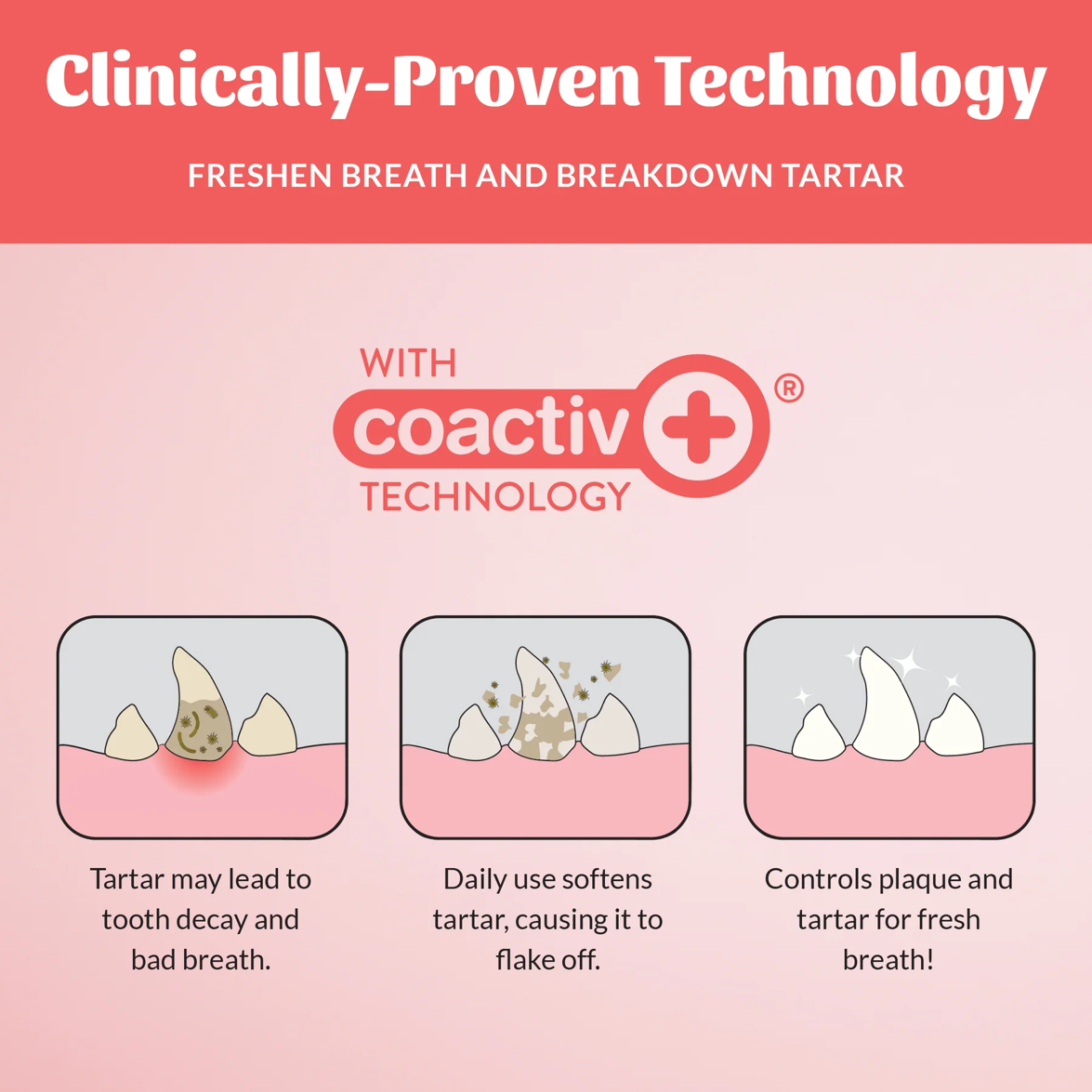 Tasty Peanut Butter & Bacon oral gel, powered by coactiv+® technology to reduce tartar, freshen breath, and support daily oral care. No brushing required! Just apply to the gumline and let them enjoy.